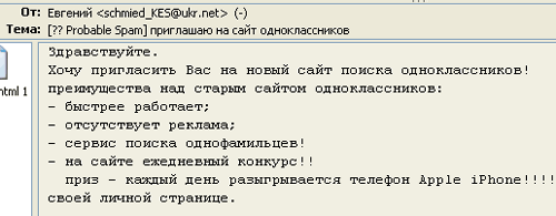 Эти уроды из KM.ru мало того что сперли Одноклассников.ру один в один (могли бы, кстати, найти и более достойные аналоги с точки зрения движка), так они теперь в плане раскрутки своего мертворожденного таракашки еще и нагло спамят рекламой этого убожества. Причем это именно чистый спам, а не какая-то адресная рассылка.