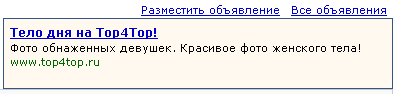 Одиозный дибровский онлайновый проект "Топотоп", который позиционируется как супермегапортал, созданный высочайшими интеллектуалами за 15 килотонн баксов для сугубых интеллектуалов, а на деле представляет собой нечто совершенно флешово-невнятное в куче ужасных рюшечек, развивается во вполне закономерном направлении. Сегодня увидел в Яндекс.Директ новую рекламу этого суперинтеллектуального портала. Вот эту: