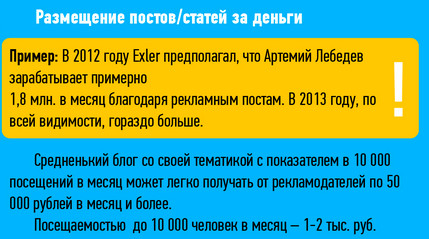 Ну и еще посмотрите, какая бредятина там написана ниже. Средненький блог с показателем в 10000 посещений в месяц может легко (!) получать от рекламодателей по 50000 рублей в месяц. Ага. ЩАС.