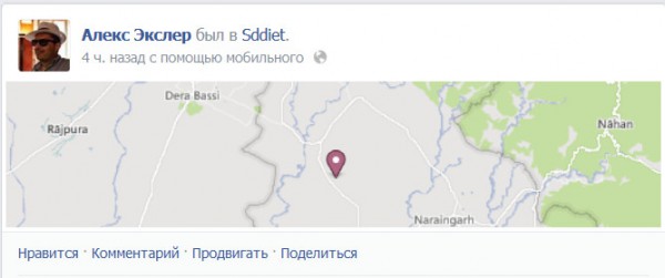 Зашел на свою ленту в Facebook и с неимоверным удивлением увидел вот такую запись. Якобы сделанную с мобильника. С указанием моего местоположения где-то в Индии. Я, конечно, понимаю, что нас, экслеров, пять человек, но ни один из нас в Индии ни разу не был. У кого-нибудь есть какие-то предположения, что это за хрень и откуда она взялась?