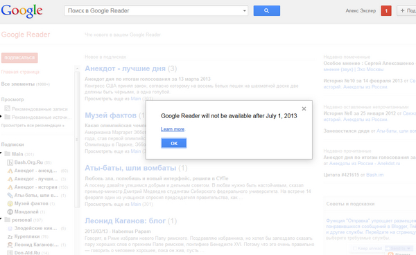 Сейчас пришла еще более "приятная" новость: Google закрывает лучший, на мой взгляд, агрегатор RSS-потоков Google Reader - вот новость в их блоге. Это у них называется "весенняя чистка". Почистили, блин. Ладно еще когда чистят провалившиеся проекты, вроде этого Wave (вроде так он назывался), который некоторые забавные IT-журналисты поспешили обозвать "революционным" и пообещали, что через некоторые время ни кино, ни телевидения не будет, а останется один лишь только Wave.