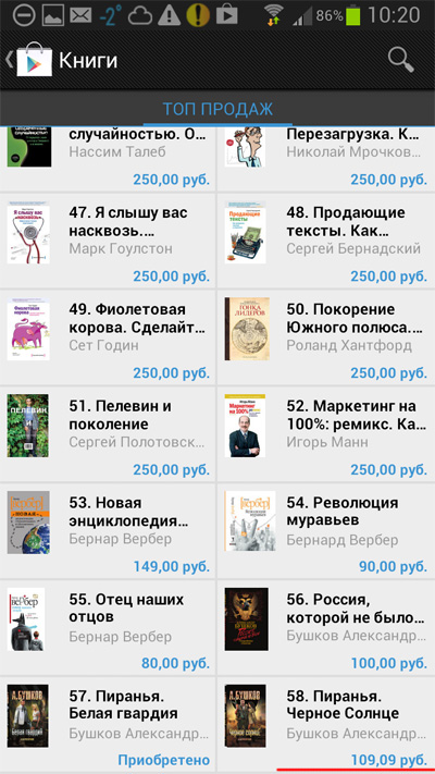 В Google Play для российских пользователей стали доступны для покупки книги и фильмы (пока без музыки). Ну, ура, ура. Скачал для теста Бушкова.