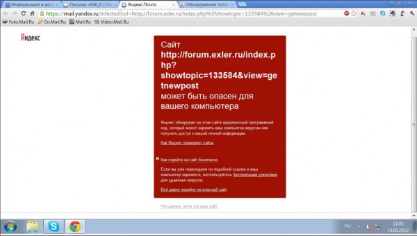 С утра этого дня Яндекс стал считать сайт forum.exler.ru зловредным. У пользователей, которые пытались перейти на форум с сайтов Яндекса, стало появляться вот такое сообщение.