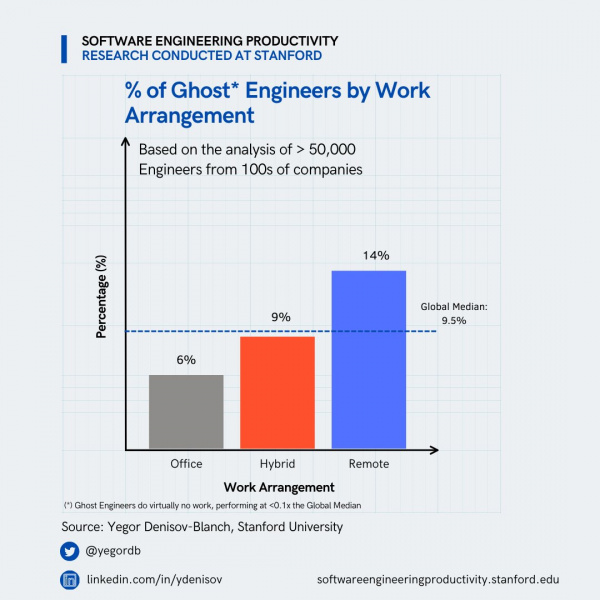 Оказалось, 14% инженеров-программистов, работающих удаленно, практически не выполняли никакой работы, то же самое касается 9% трудящихся одновременно удаленно и в офисе, а также 6% работающих в офисе постоянно. В среднем этот показатель составляет 9,5%.