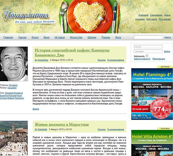Проект "Италомания", который на некоторое время останавливался из-за проблем с финансированием, снова в строю. Напомню, что это блог блогов об Италии. Участники проекта ведут собственные блоги со статьями о различных аспектах этой замечательной страны, а редакторы проекта отбирают самые интересные статьи и публикуют их на главной странице "Италомании". За публикацию на главной странице участники "Италомании" получают гонорары.