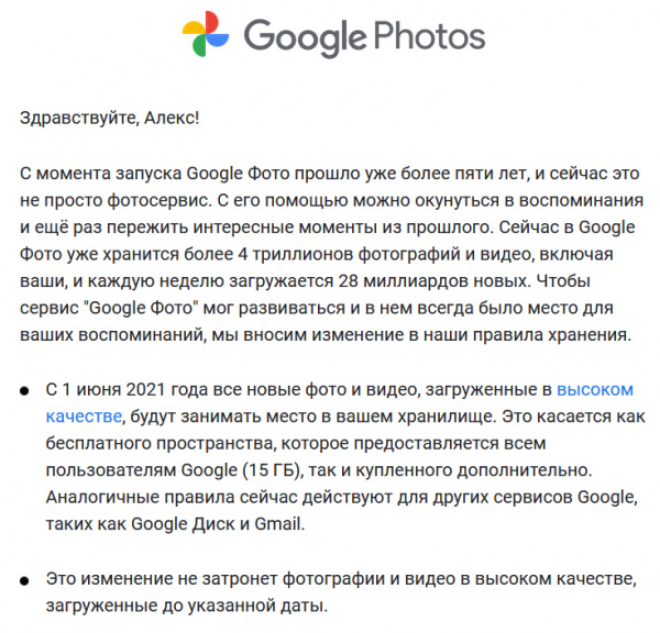 Компания Google прислала письмо о том, что безлимитное хранилище фотографий в Google Photos, которое они предоставляли много лет, закончится 1 июня 2021 года. Старые фото в облаке сохранятся, все новые фото начнут занимать пространство Google Drive, в котором бесплатно предоставляется всего 15 ГБ, причем оно также используется другими сервисами Google, такими как GMail и прочие.