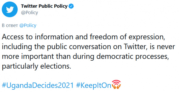 Оцените пафос заявления - "Доступ к информации и свобода мнений, включая публичное общение в "Твиттере", как никогда важны в ходе демократических процессов, особенно во время выборов", написали в Твиттер, где навсегда забанили Трампа и его сторонников - ну, чтобы реализовать свободу мнений, разумеется, - и которые блокировали посты издания NYPost во время американских выборов, о чем им активно напоминают в комментариях к этому потрясающему заявлению. Да здравствуют выборы в Уганде, да здравствует свобода мнений!
