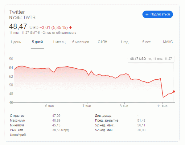После вечной блокировки аккаунта Трампа и многих его сторонников акции Твиттера рухнули на 12,3%. Аналитики это падение оценивают в 39 миллиардов капитализации. Интересно, что на это скажут акционеры?