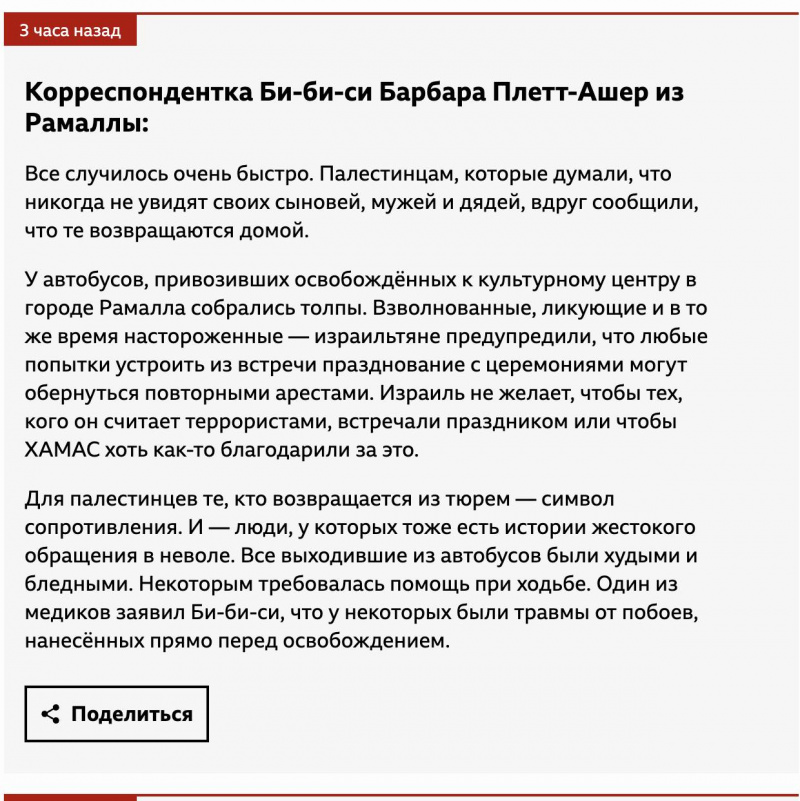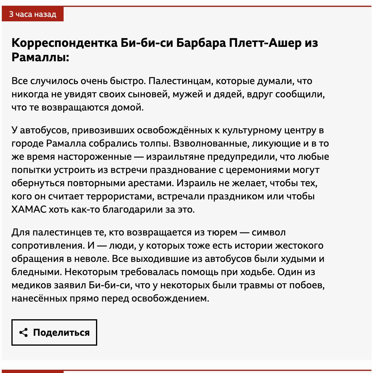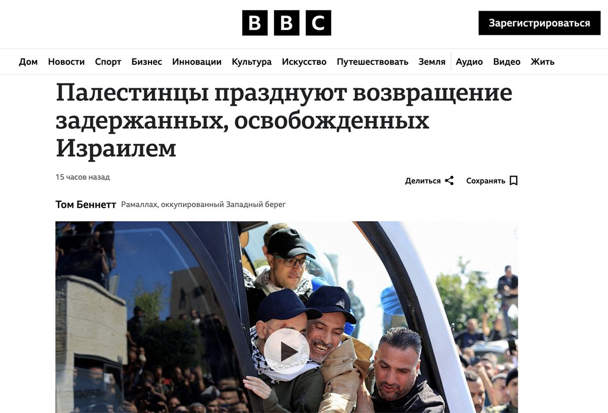 А еще в BBC был трогательный репортаж о том, как несчастные "задержанные" возвращались домой. Подлые израильтяне при этом не дали устроить празднования. Потому что они задержанных считают террористами. А ведь многие из задержанных в тюрьмах похудели и побледнели. Вот до чего эти подлые евреи доводят.