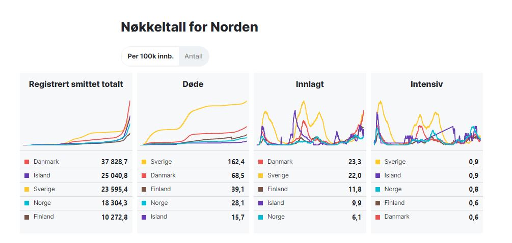 Ну что. Я опять со своими данными по Скандинавии. Слева направо: количество заражений на 100 000 (брутто), количество умерших на 100 000 (брутто), количество госпитализированных на 100 000 (нетто в каждый текущий момент времени), количество людей в отделении интенсивной терапии на 100 000.