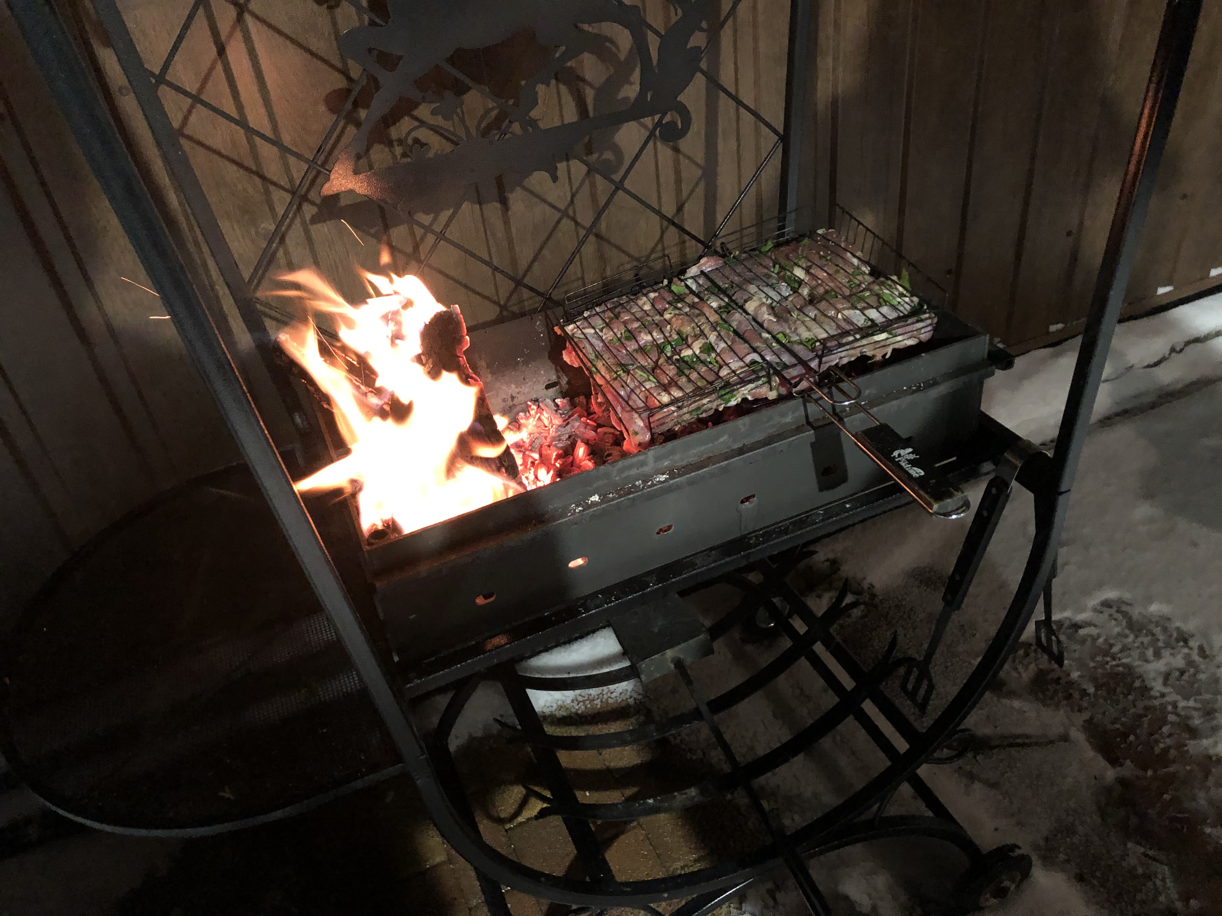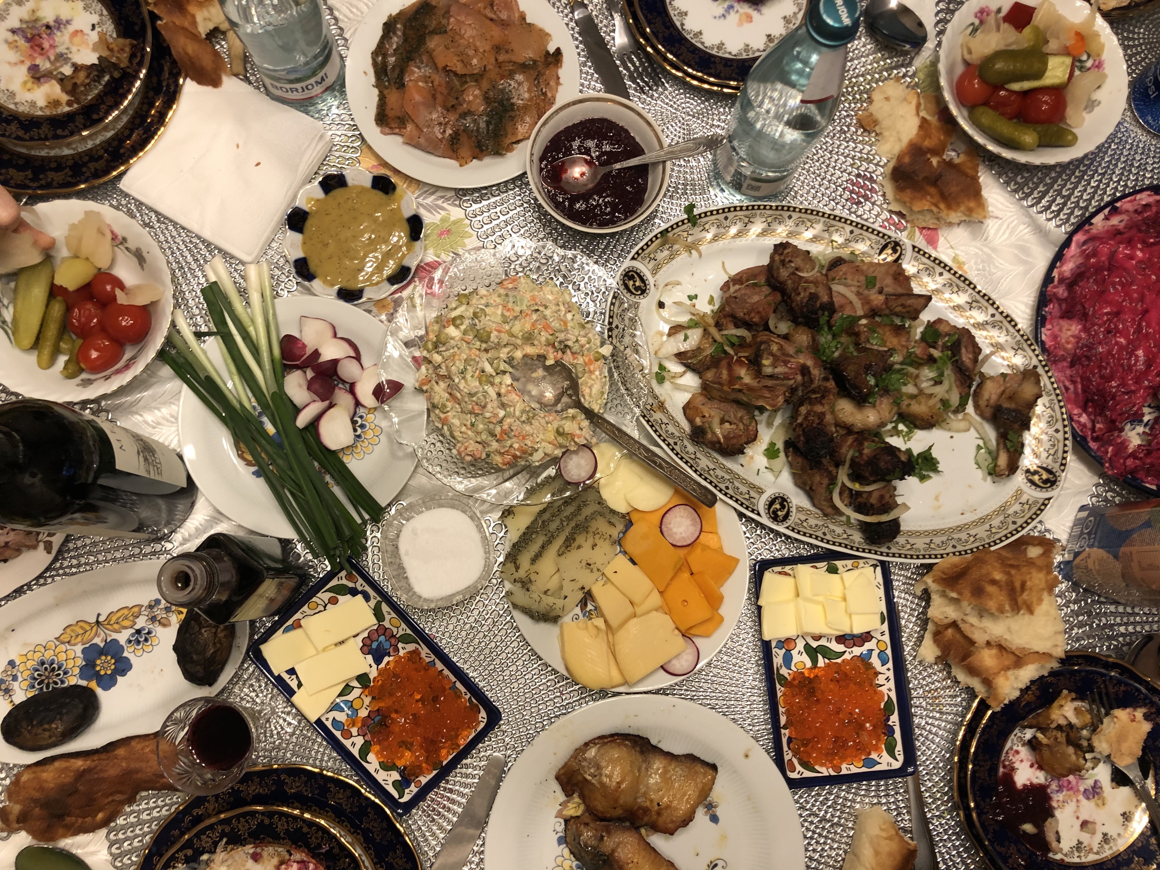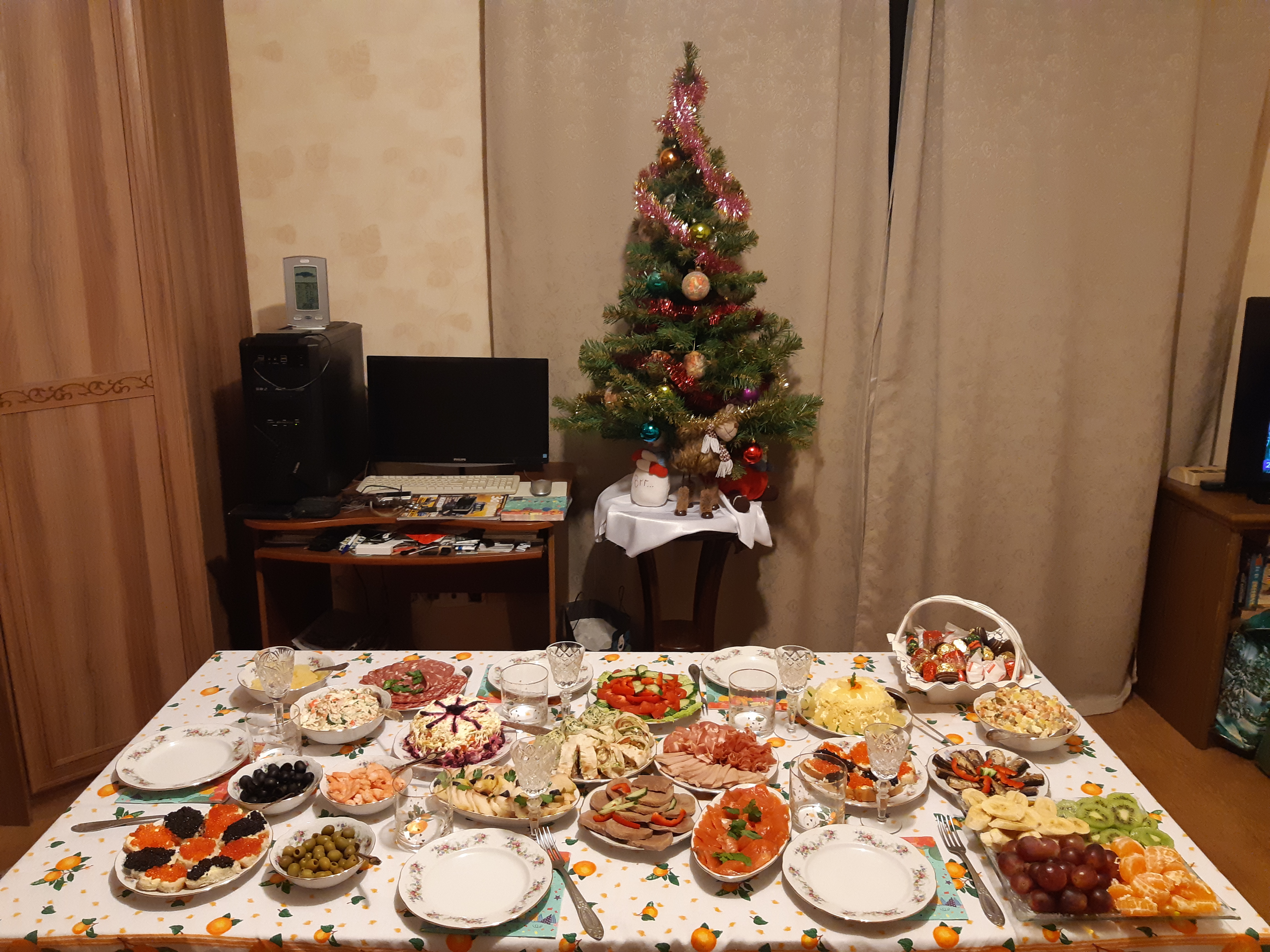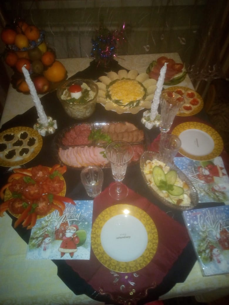 Стейки на газовом гриле, картошечка отваренная с морковью, бататом и луком со скиром, тазик оливье и мандаринки (раздельно), канапешки с красной икрой, Glenfiddich пятнашка и Dalwhinnie мальчикам, Primitivo di Manduria девочкам, эклеры, наполеончики и два банана, ассорти из всего этого наглым быстрым длиннолапым котикам, сухой корм с обильным гостевым массажем собакену, козий сыр в крысоловке гаражной крыске. Как-то так ?