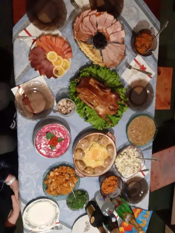 Эх, я тоже не сфоткала))) пара салатиков, бутеры с икрой, холодец и тирамису домашнего приготовления. Горячее не готовим уже несколько лет, так как до него не доходит. Готовлю его на следующий день на ужин.)