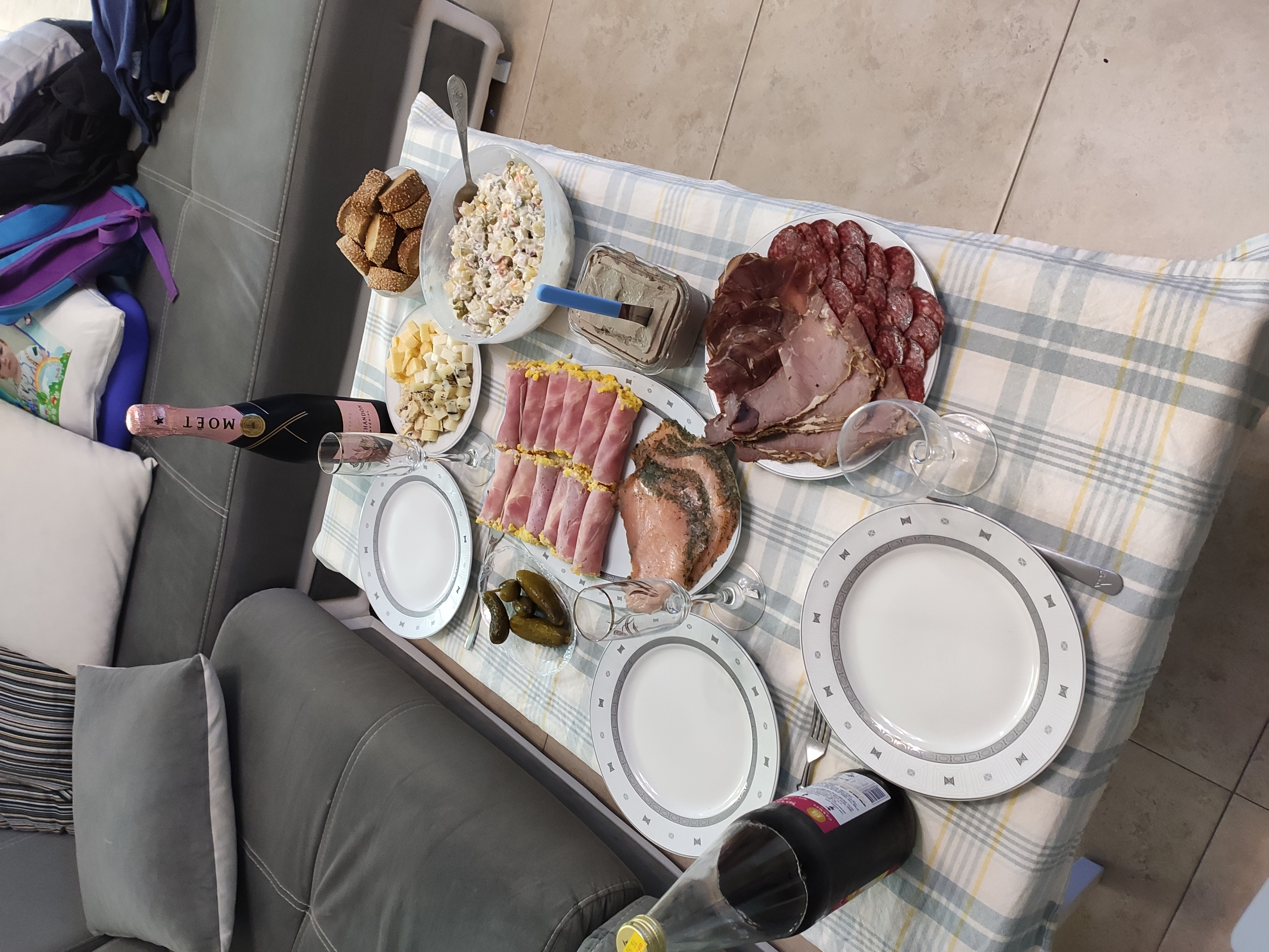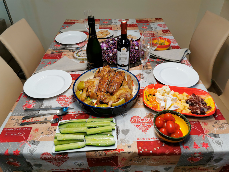 У нас последние лет семь подход к рождественскому-новогоднему столу (когда мы отмечаем одни, без гостей) очень простой. Какое-то горячее блюдо (обычно утка или гусь), сыры, хамон, оливки, овощи. И все. Всякие оливье и так далее мы не употребляем и не делаем, больше ничего для застолья нам не нужно. При этом подготовить такой стол занимает минут двадцать (ну, кроме утки, которая пару часов запекается), и еще все равно на завтра что-то остается.