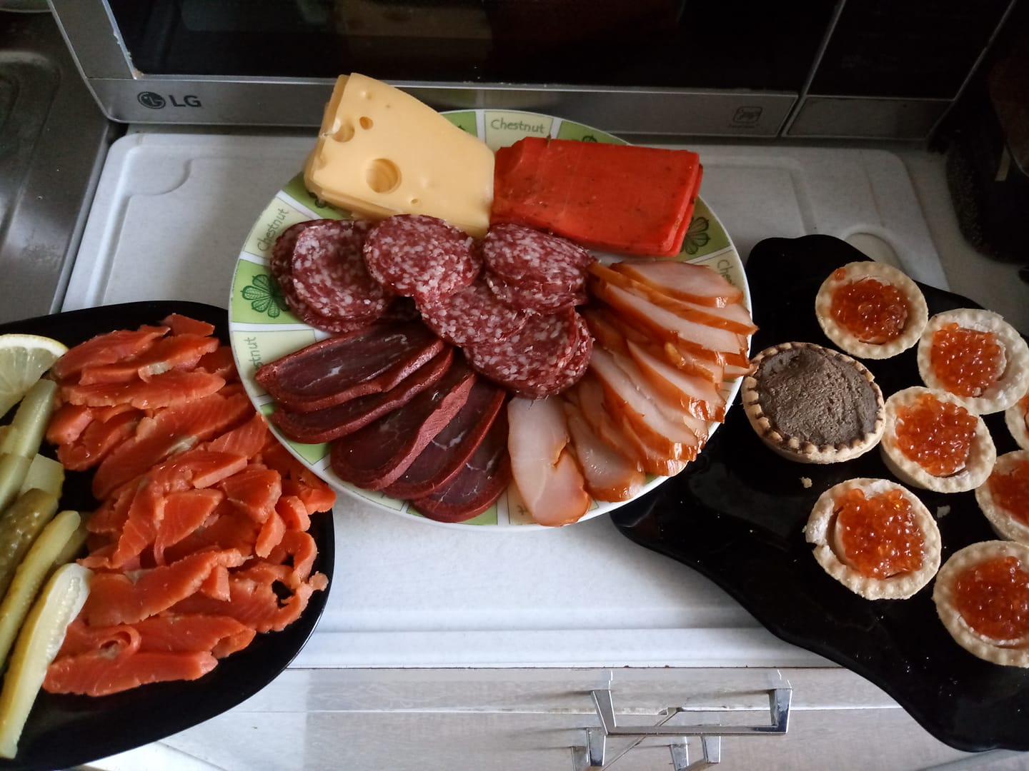 Икра, форель горячего копчения, оливки, маринованные (ручками супруги) грибы, мандарины как дань традиции. Сыры. Немного селёдки.