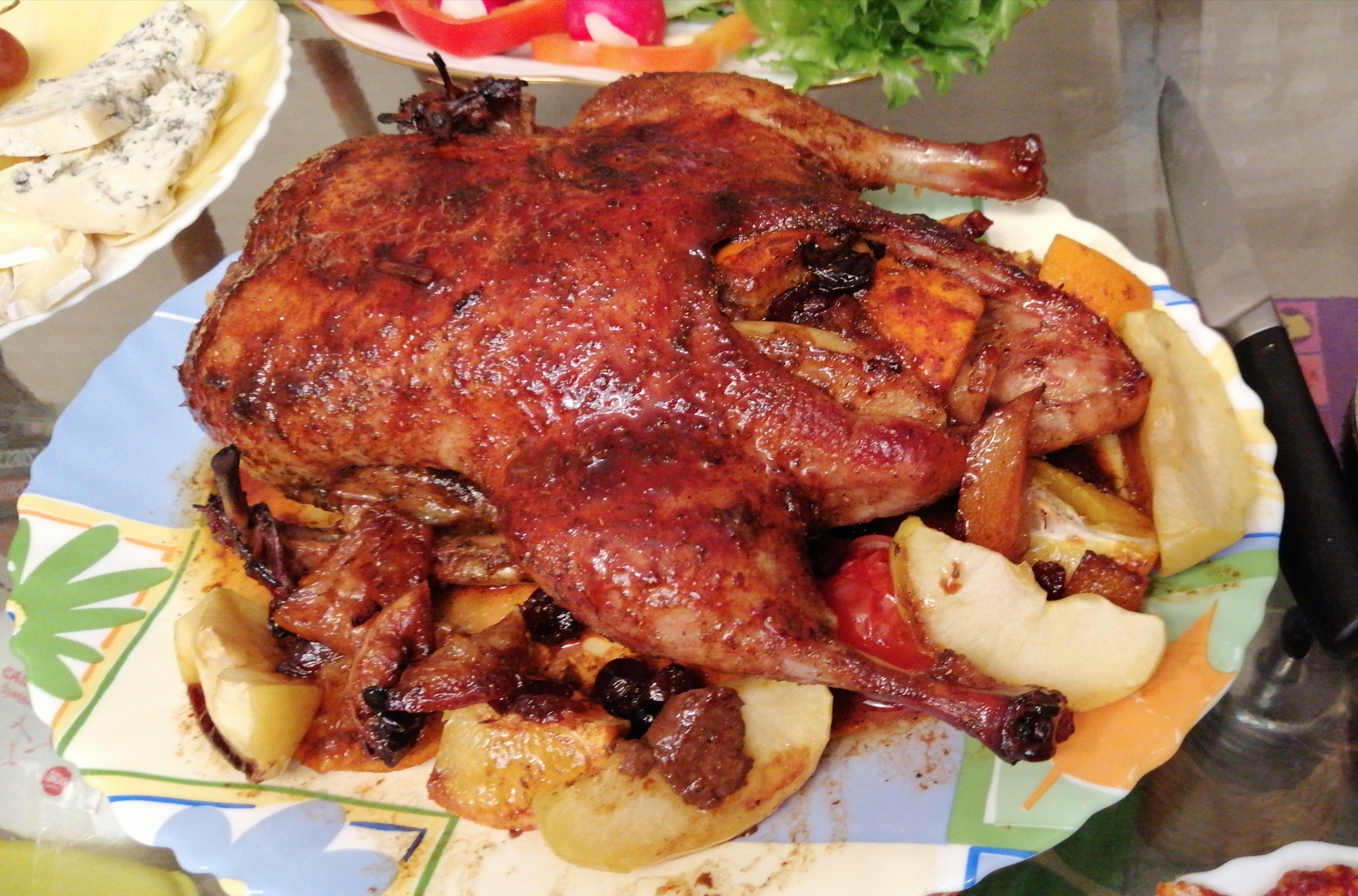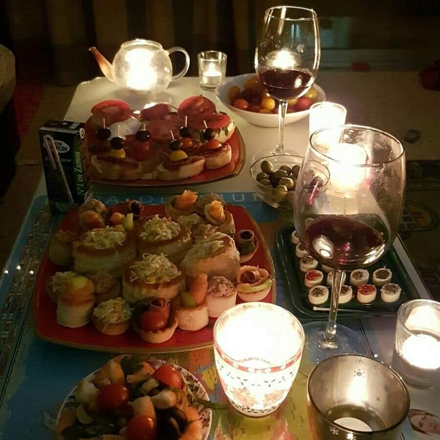 Вот и в этот раз. Утка с яблоками, сыры, хамон, оливки, огурцы-помидоры. Хорошее игристое (Recaredo), бутылка приличного бордо. Отлично посидели.