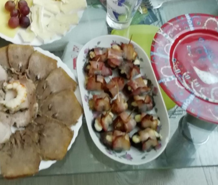 А ещё всегда на НГ делаем вредную, но чудесную закуску: чернослив и финики (отдельно) заворачиваем в тонкую полоску бекона, внутрь кусочек грецкого ореха и твёрдый сыр, затем минут на 10-15 в духовку. Жаль фото смазанное.