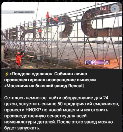 В свою очередь мэр Москвы Сергей Собянин объявил, что власти города решили возобновить производство легковых автомобилей под брендом «Москвич» на московском заводе «Рено», а также сохранить большую часть коллектива предприятия. (Отсюда.)