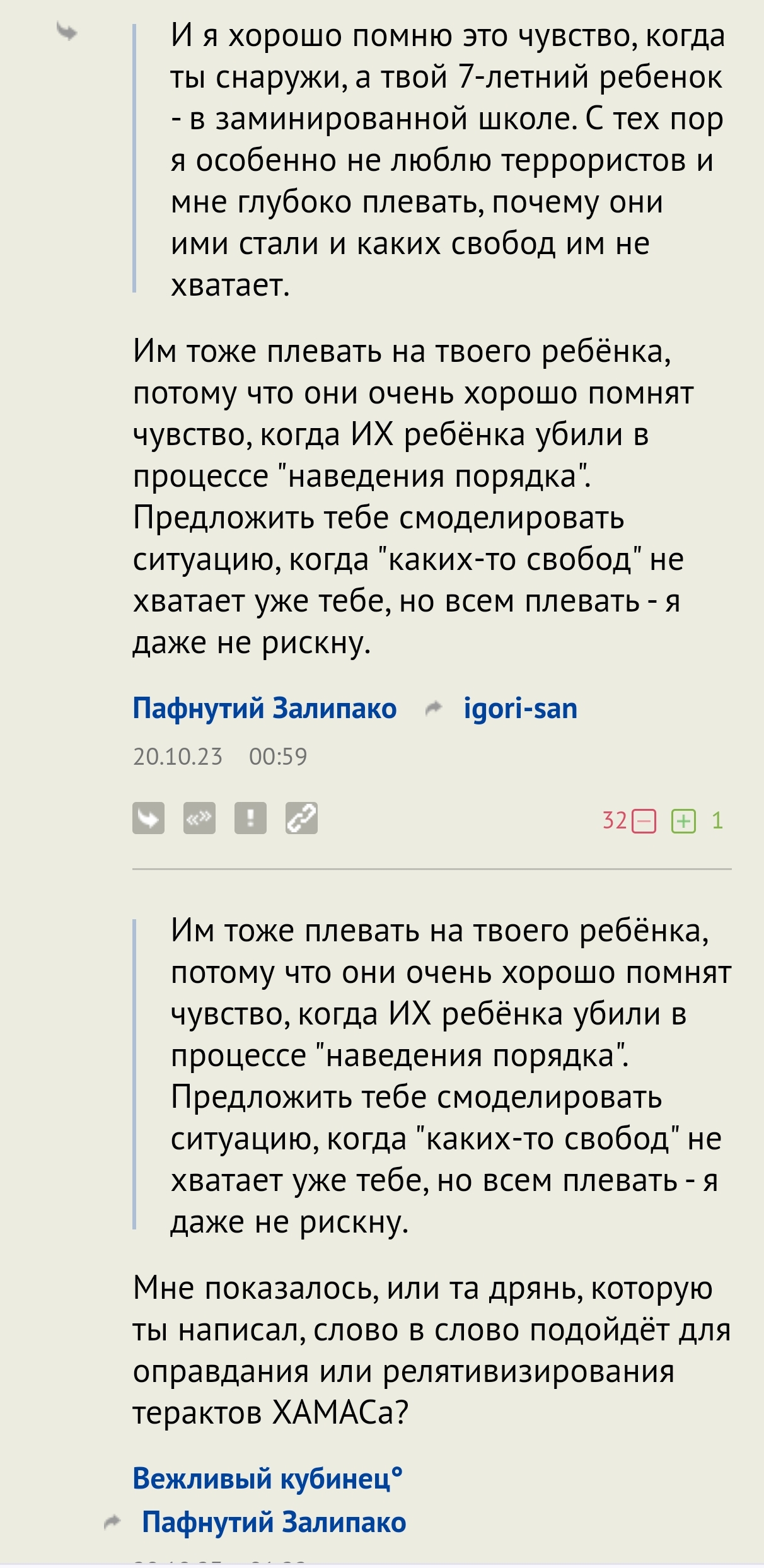 К мирным жителям Газы у меня ни малейшего сочувствия нет. И всякие уступки им вызывают у меня такое же негодование. Какое решение может принять страна, у которой руки связаны лицемерной мировой общественностью с Гретой Тунберг во главе?