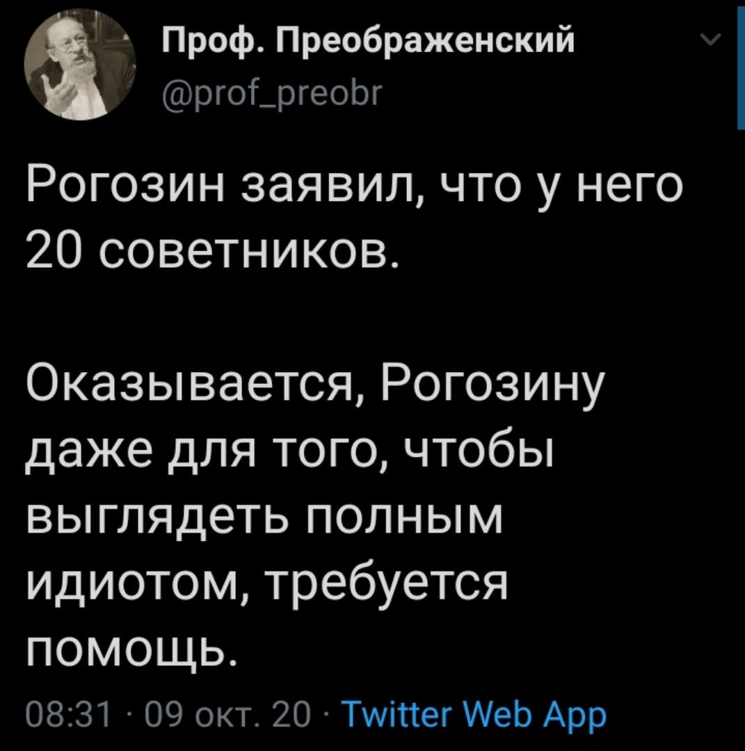 Как бы-то ни было, теперь уже твиты Рогозина/"Федора" этой ночью произвели эффект разорвавшейся бомбы. Причастные и находящиеся "в теме" в шоке, все абсолютно убеждены, что Дмитрий Рогозин вчера сильно бухал и его оскорбленная душа не выдержала, вылив всю накопившуюся обиду в паблик через аккаунт "Федора", в связи с чем глава пресс-службы Владимир Устименко сегодня с самого утра, подчищая дерьмо за своим шефом, истерично обзванивает все российские СМИ, чтобы эта история не попала в паблик.