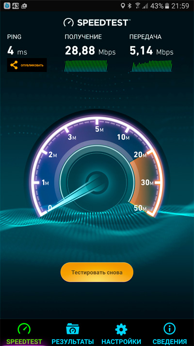 И посыпаю голову пеплом. SpeedTest от Ookla показал мне 65/20 мбит. Оптимистично так. Проверил скорость другими тестерами.