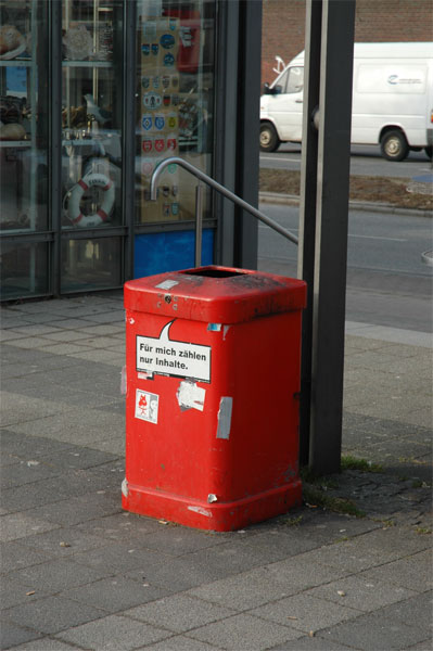 Года три назад в городе началась компания по наведению чистоты на улицах. По этому поводу коммунальные службы перекрасили все урны в красный цвет и начали клеить на них смешные надписи - для тех кто может оценить юмор и игру слов на немецком вот ссылка , например, "Красные идут", "Предъявите ваши бумаги", "Когда я вырасту я стану контейнером", "Одной ногой в ЧМ", "Занимаюсь грязными делишками", "Жру даже гамбургеры" и т.д. Город действительно стал чище.