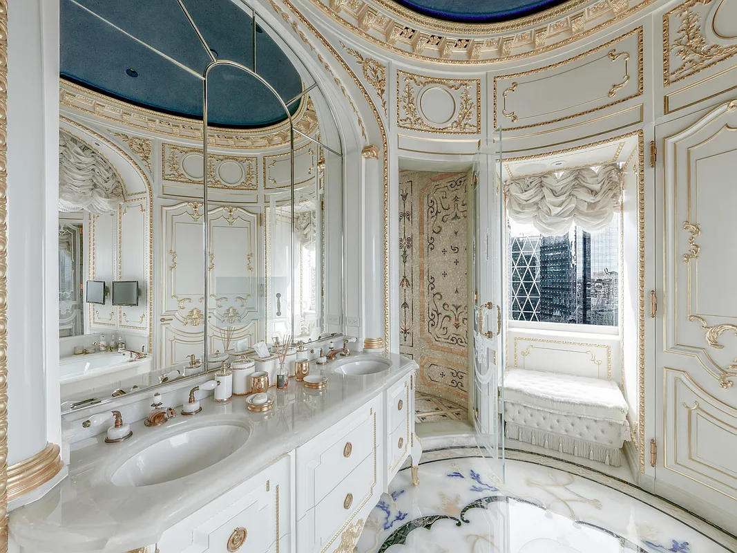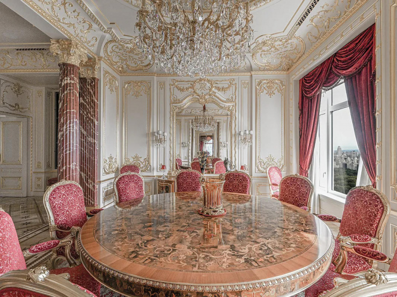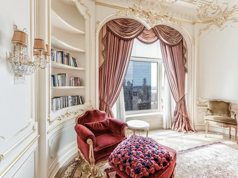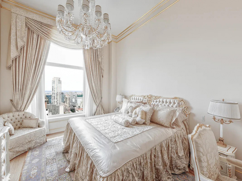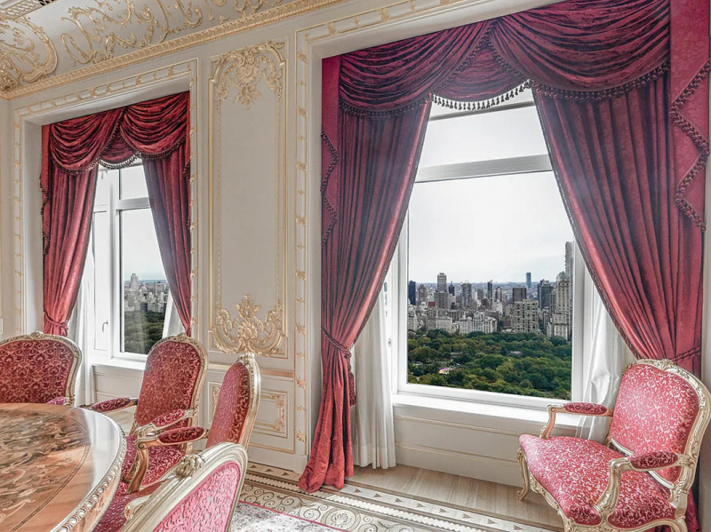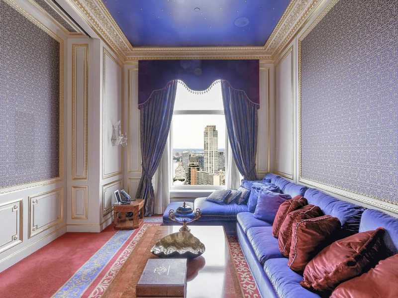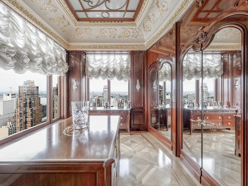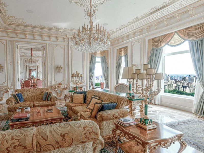 Квартира площадью 492 кв. м расположена на 10 этаже здания на пересечении Пятой авеню и Саут-Сентрал-Парк в Манхэттене, с видами на Центральный парк. В апартаментах четыре спальни, четыре ванных комнаты и собственная башенка, стилизованная под замок. Интерьер риелторы описывают как «экстремальный Версаль»: использованы отделка из 24-каратного золота, дорогие породы камня, венецианская штукатурка, сводчатые потолки.