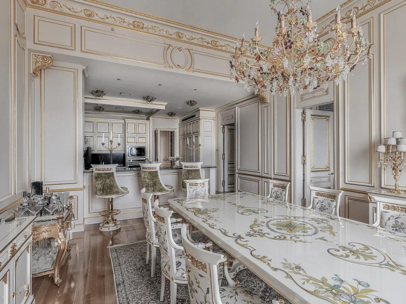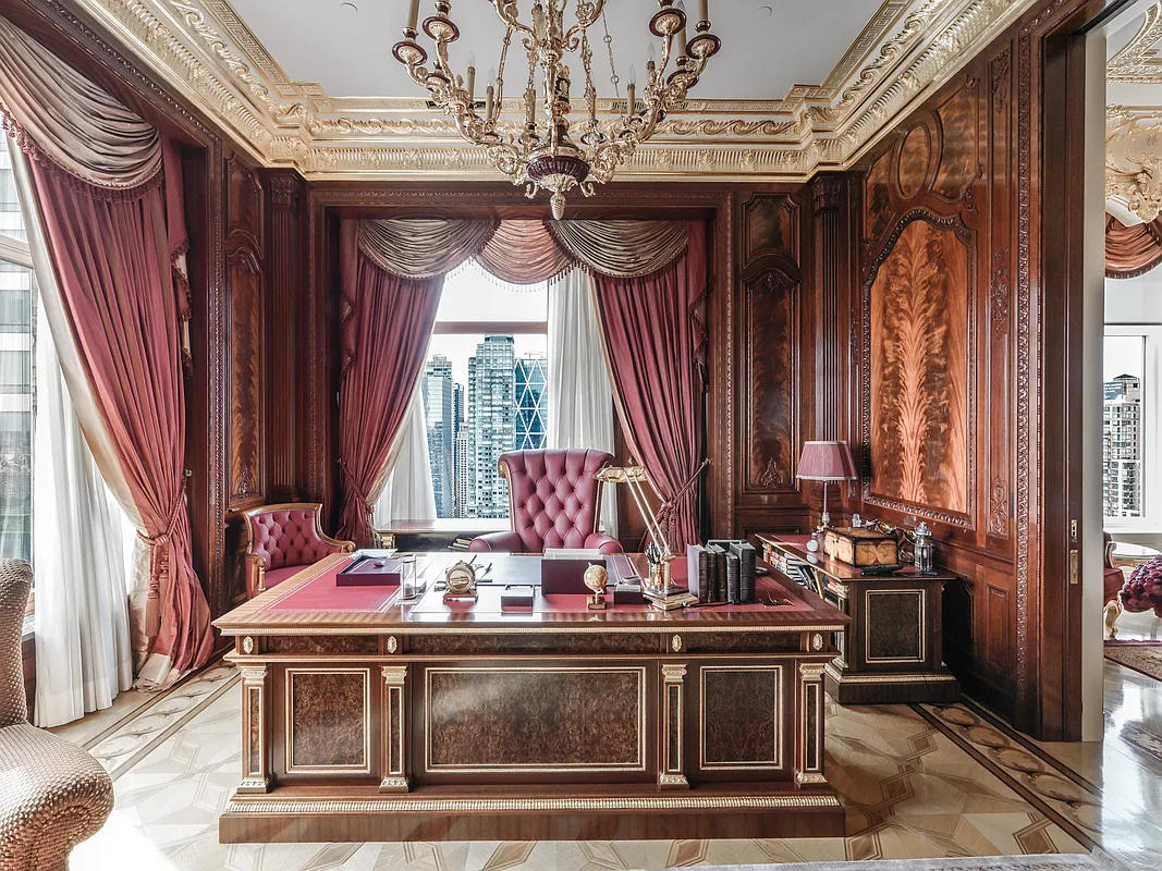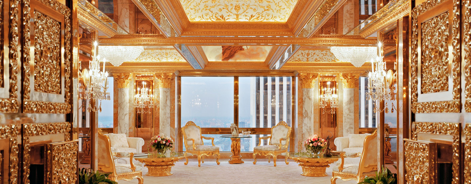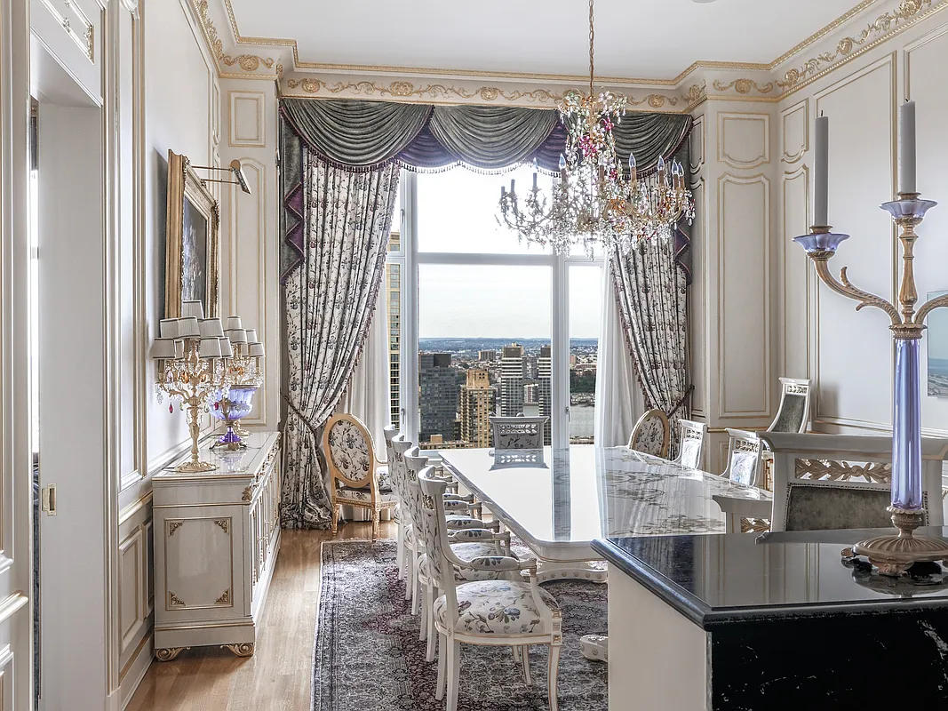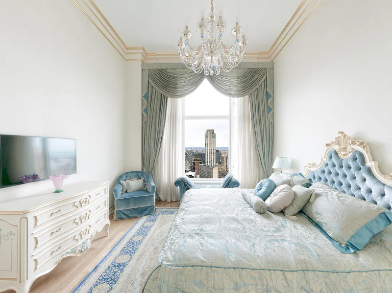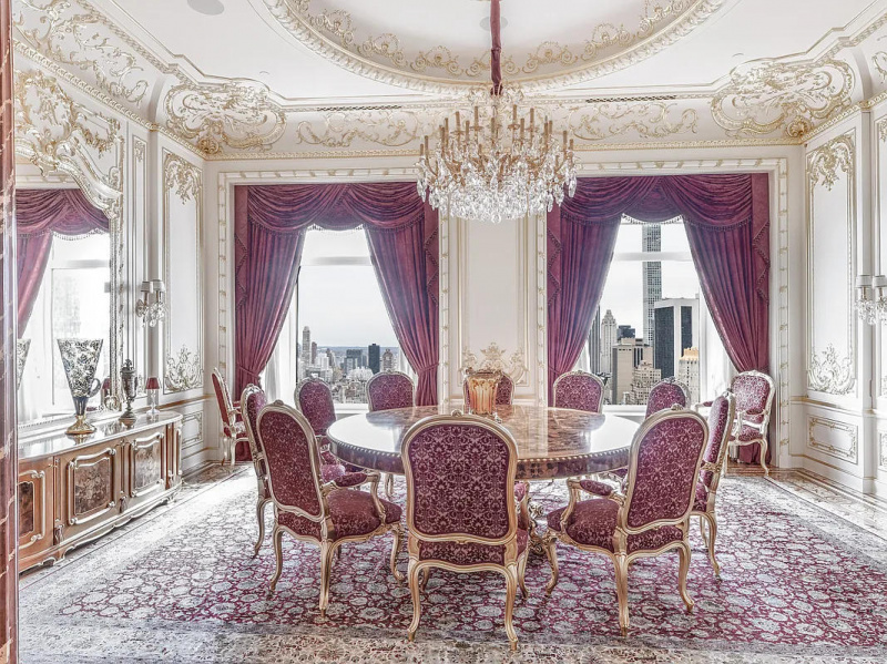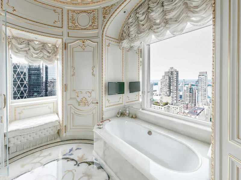 Квартира площадью 492 кв. м расположена на 10 этаже здания на пересечении Пятой авеню и Саут-Сентрал-Парк в Манхэттене, с видами на Центральный парк. В апартаментах четыре спальни, четыре ванных комнаты и собственная башенка, стилизованная под замок. Интерьер риелторы описывают как «экстремальный Версаль»: использованы отделка из 24-каратного золота, дорогие породы камня, венецианская штукатурка, сводчатые потолки.
