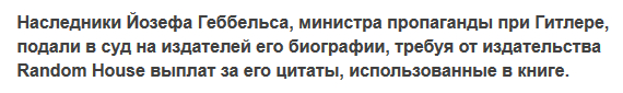Блин, вроде в тексте той же самой новости откуда приведена цитата четко написано что правами на дневники Геббельса владеет дочка нацитского министра Шахта (полностью оправданного на Нюрнбергском процессе)