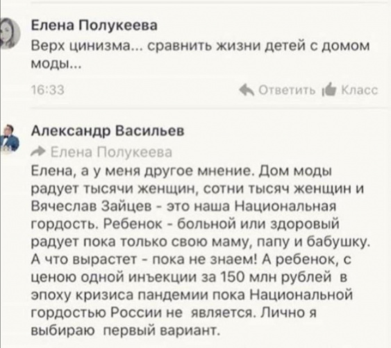 «Верх цинизма — сравнить жизни детей с домом моды», — ответила на его комментарий подписчица. «У меня другое мнение, — написал Васильев. — Дом моды радует тысячи женщин, сотни тысяч женщин, и Вячеслав Зайцев — это наша национальная гордость. Ребенок — больной или здоровый — радует пока только свою маму, папу и бабушку. А что вырастет — пока не знаем!»