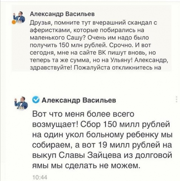 Такой знаменитостью стал и Александр Васильев. В ответ на просьбу помочь Ульяне Васильев назвал волонтеров аферистами. Телеведущего смутило, что ему уже писали и «побирались на маленького Сашу», сумма была такой же («Золгенсма» стоит для всех благотворительных сборов одинаково). А значит, это мошенники, решил Васильев. Там же он написал, что его возмущает сбор 150 миллионов на один укол больному ребенку, а вот «19 миллионов рублей на выкуп Славы Зайцева из долговой ямы мы сделать не можем».