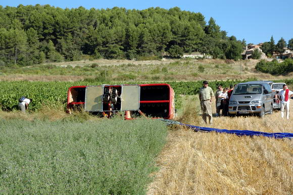 Приземлились мы опять-таки в совершенно произвольном месте (куда ветер пошлет), после чего гондолу подло опрокинули. Но пассажиры посчитали, что это элемент шоу, поэтому не протестовали, а только фотографировали и апплодировали.