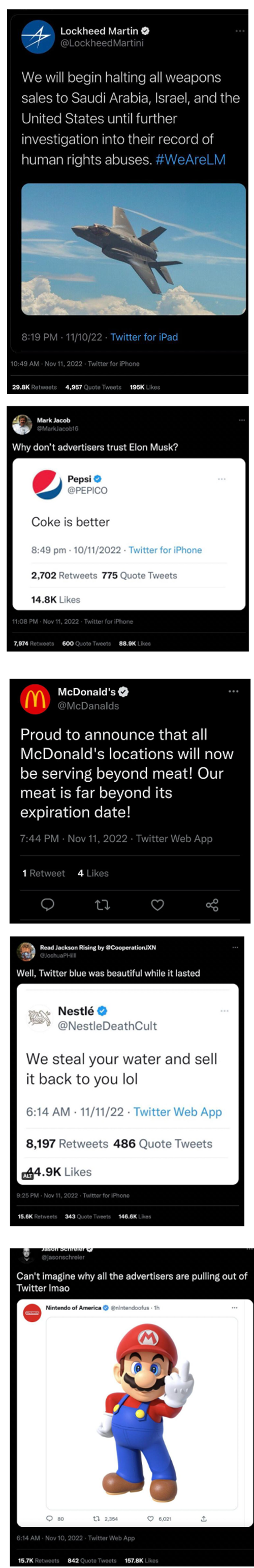 Почти сразу после покупки Twitter Маск уволил предыдущую исполнительную команду, были освобождены от должностей около 50% сотрудников компании. Это более чем 7 тысяч человек, включая большинство топ-менеджеров. Также Маск объявил, что пользователи должны платить $8 за галочку подтвержденной учетной записи без какой-либо процедуры фактической проверки. Из-за того что таким образом появляется возможность выдавать себя за другое лицо, некоторые крупные рекламодатели, включая General Mills и Volvo, вывели свои доллары с платформы.