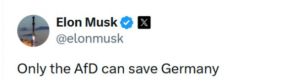 "Только AfD (Альтернатива для Германии) спасет Германию", - написал товарищ Илон Маск в своей Х-сети. Нет, ну а что - ультра-правые, пропутинские - для Маска они, конечно же, классово близкие.