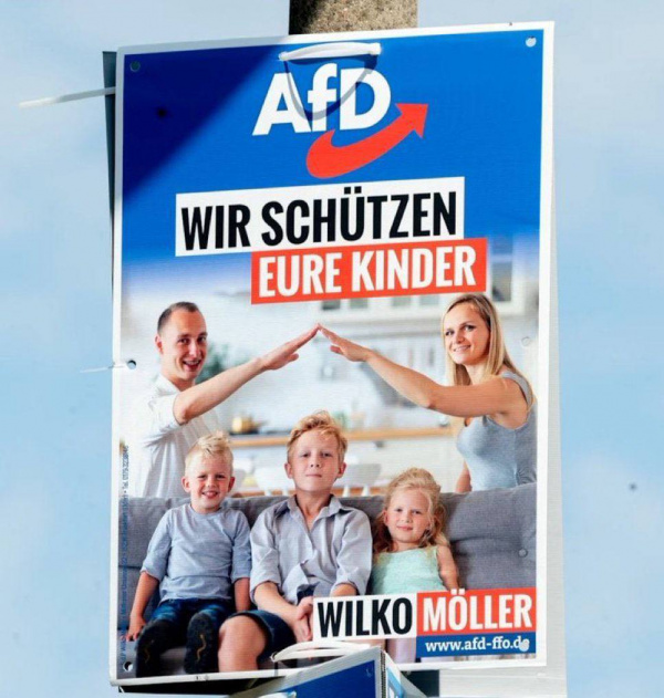 Во Франкфурте (Одер) AfD рекламируется вот таким милым плакатиком. И если вы думаете что это просто случай дизайнера-идиота, который типа как хотел изобразить крышу для детей, то в издании Bild считают, что это намеренная провокация депутата от AfD Вилко Мёллера. В ответ на предъявляемые претензии по поводу наличия явно зигующих людей на этом плакате, Мёллер строит из себя идиота и говорит, что ничего такого он не имел в виду, и что, мол, это все - "здоровый патриотизм".