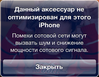 У меня похожее было, когда первый раз воткнул свой iPhone 4 в iHome (часы с приемником и разъемом для iPhone). Телефон выдал похожее сообщение, но когда стал втыкать посильнее, то все стало впорядке. Этот iHome был сделан для iPhone 3, и новый телефон вставлялся туда неплотно.