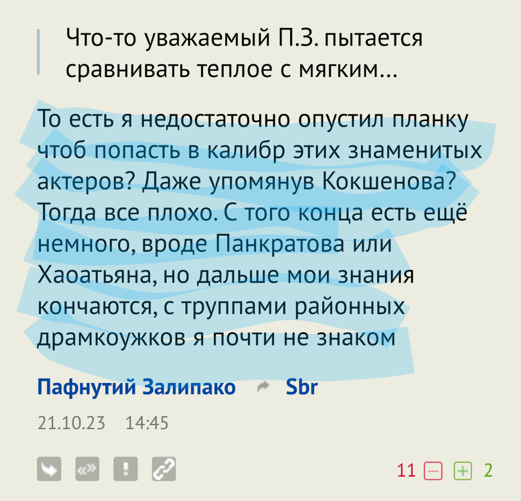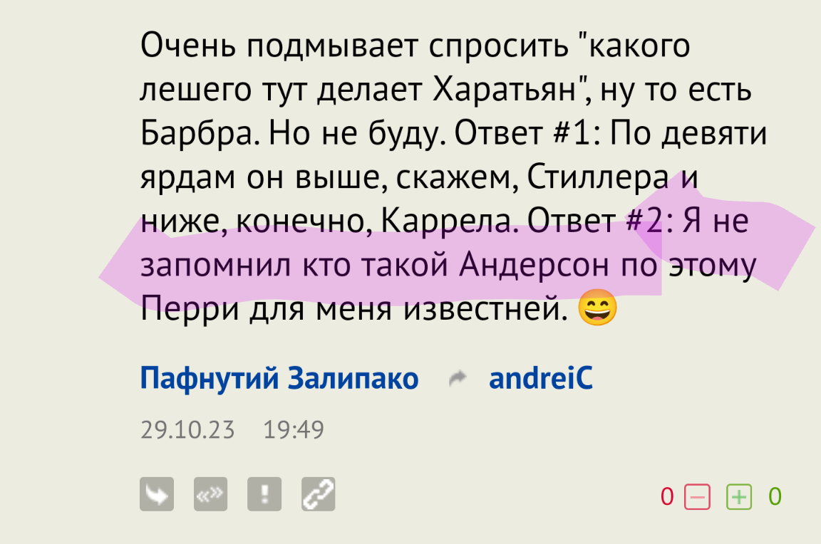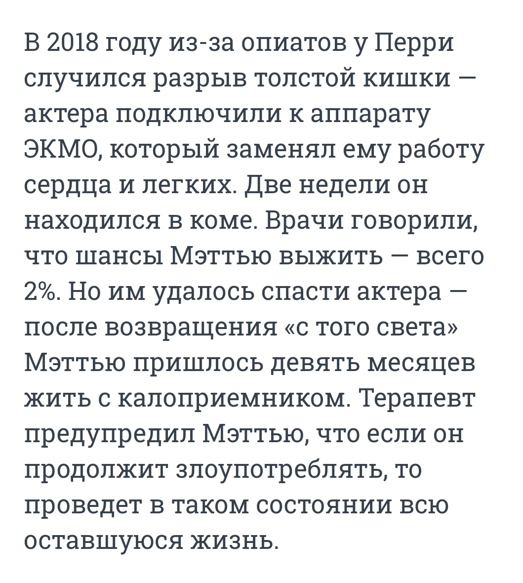 Далее. Милая девочка, мне сдаётся, что ваш последний коммент написан, исходя из предположения, что прочитав сейчас об этих ужасных проблемах в жизни Мэтью Перри, я не поверил этой информации и подвергаю её сомнению. Это такое абсурдное предположение, что я не понимаю, откуда оно взялось. Отсюда и совет проверять, гуглить и т.д. нелепо повисает в воздухе. Я не знал, сейчас я узнал, всё. Меня просто задела ваша задорная галиматья про Амазонию, будто Перри — пуп земли, и все сознательные люди должны быть в курсе перипетий его жизни 24/7. А кто не в курсе, тот см. выше. Слишком много на себя берёте, унижая собеседников направо и налево.