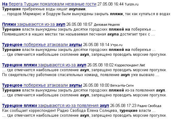 Эту новость прочитала какая-то наша акула пера и передала ее по цепочке с заголовком "В Турции закрыли пляж из-за акул". Следующая акула пера переправила заголовок на "В Турции закрывают пляжи из-за акул". Ну и далее Россию потрясли заявления о том, что берег Турции буквально кишит злобными акулами-убийцами, а туризм там уже навсегда закончился как класс. Не верите? Прошу: