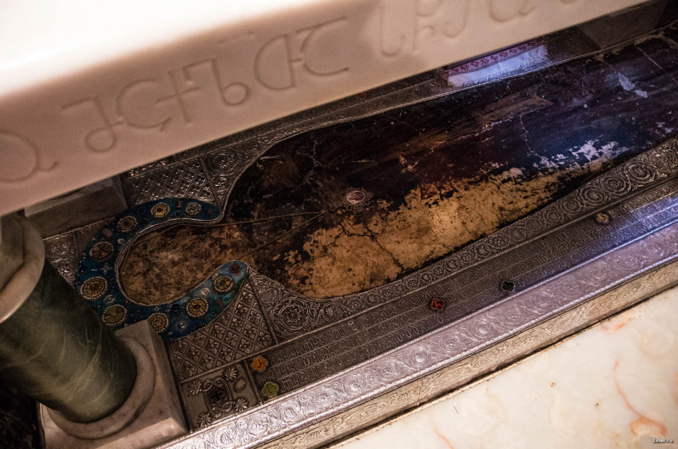 По легенде Нина сама завещала, что ее нужно похоронить в этом месте. Царь Мириан, которого Нина обратила в христианство, хотел перенести останки святой в тогдашнюю столицу Грузии - Мцхету, но, опять же по легенде, останки Нины не смогли сдвинуть с места, и она была похоронена здесь, над Алазанской долиной.