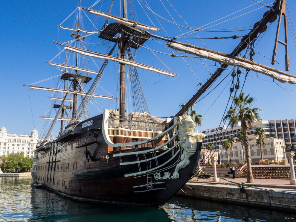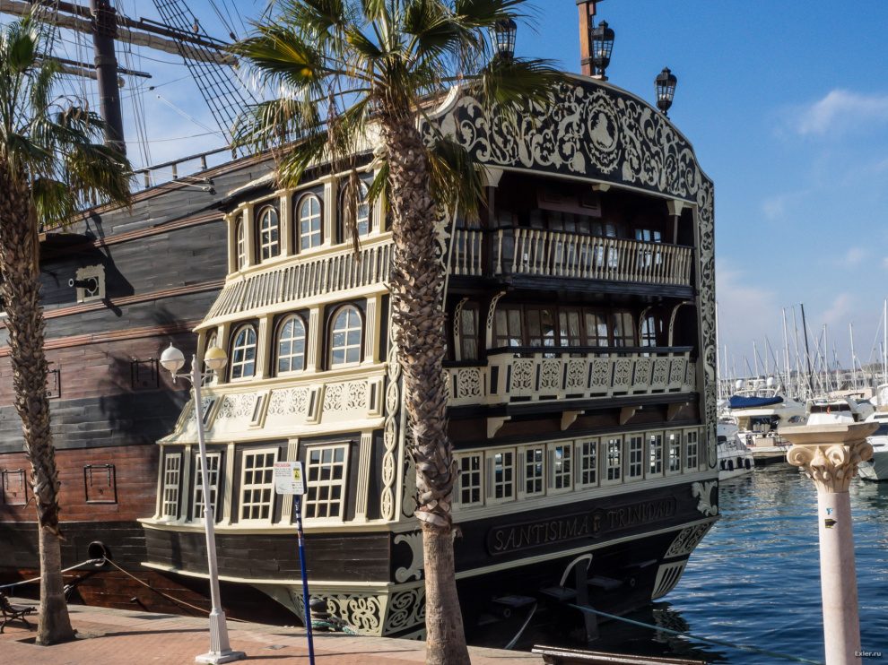В марине среди катеров и яхт обнаружилась вот такая прелесть - старинный испанский линейный корабль "Сантиссима Тринидад". Ну, точнее, это копия того самого корабля, который участвовал в битве у Трафальгара, а потом затонул во время шторма при попытке буксировки сильно пострадавшего судна в Габралтар.
