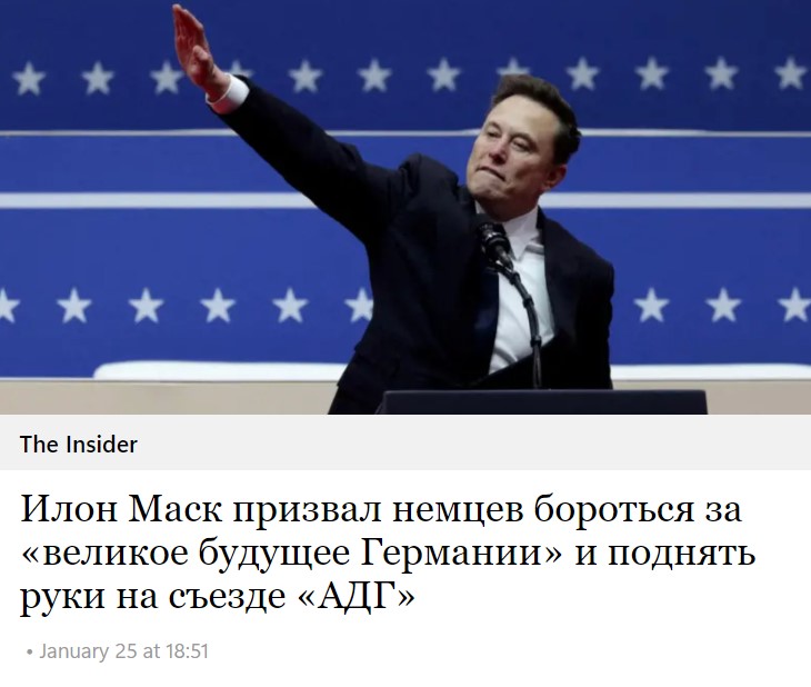 Это если не задаваться вопросом, при чем там вообще Маск? Где Германия - и где Маск? Нет, оно понятно, что АДГ подобное внимание самого богатого человека в мире - очень льстит. Еще недавно они были маргиналы-размаргиналы, а теперь сам Маск называет их последней надеждой Германии.