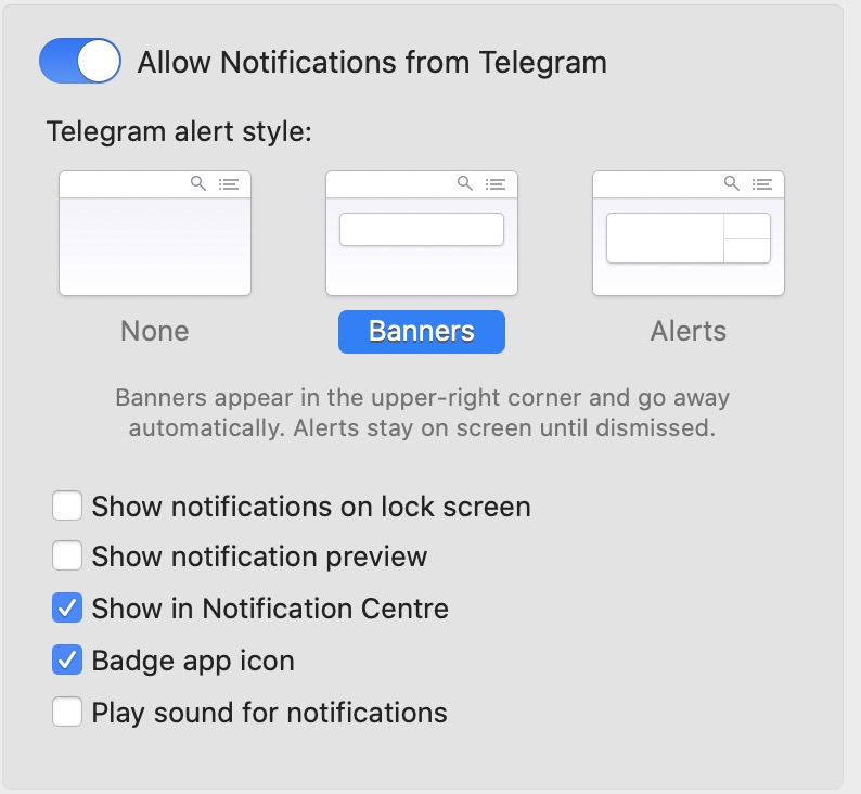 Mac System Preferences / Notifications / Telegram - настройте под себя, и никакой альтернативный клиент не понадобится.