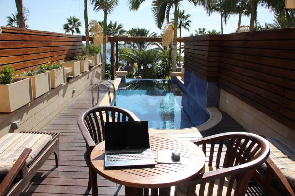 Спрашивали - где я остановился на Кипре. Да как обычно - в частном секторе: в Amathus Beach Hotel. Потому что только в "Аматусе" есть такая прелесть, как номера с персональными бассейнами, в которых вода, как выяснилось, еще и подогревается. Да, жуткое буржуйство, согласен. Но это реально очень классно! Плюс - у них собственный пляж, что вообще на Кипре - большая редкость.