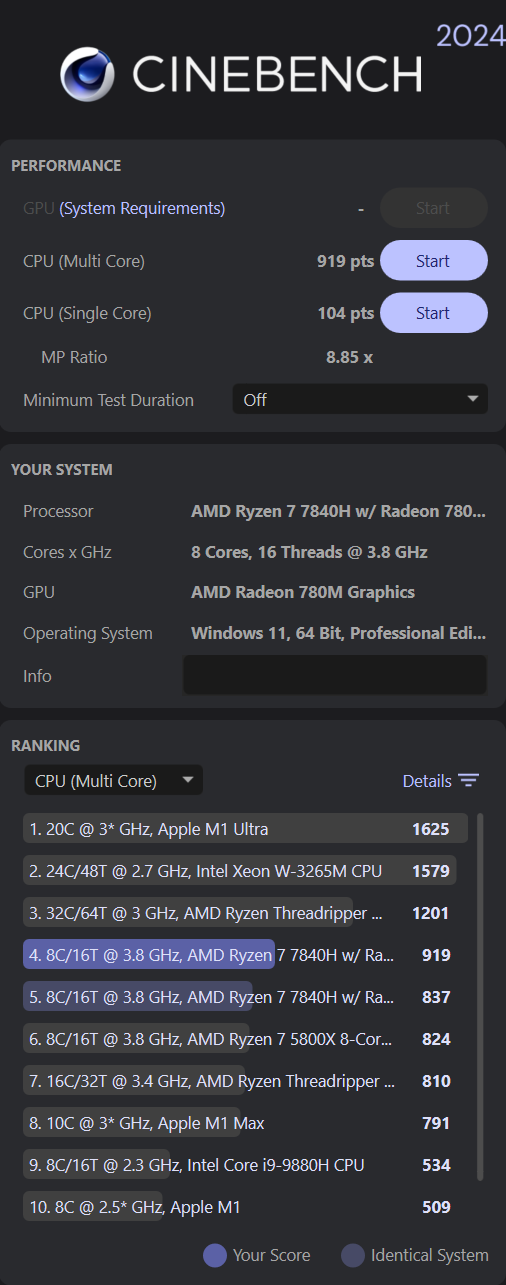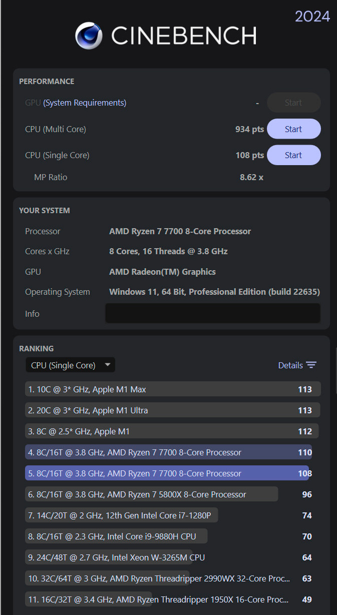 108/934 в CineBench2024 - это точно нормальное быстродействие для десктопа? Просто у меня ноутбук на Ryzen 7840HS ровно столько же выдавал
