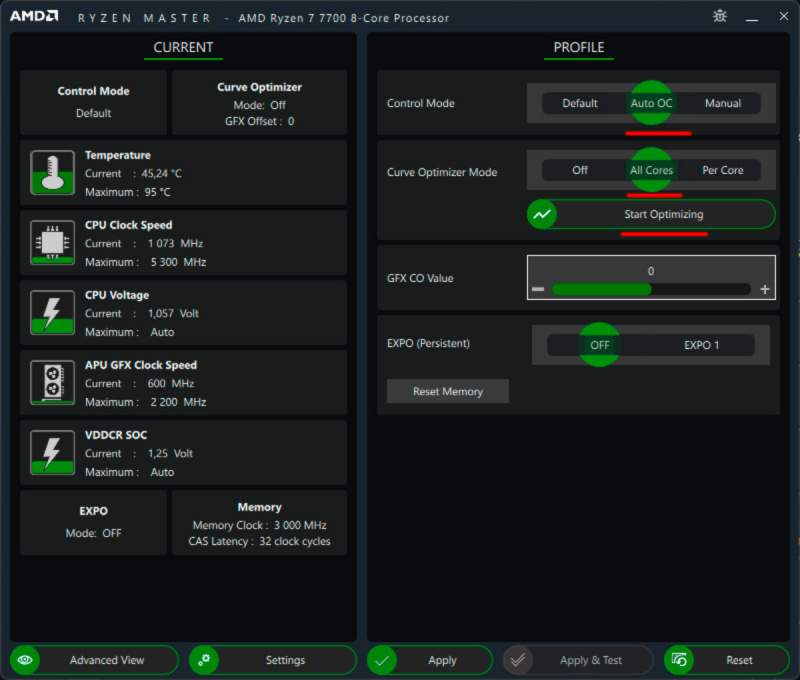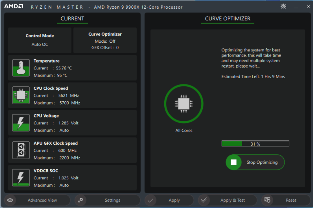 Дальше самое важное. В Control Mode выставить Auto OC, в Curve Optimizer Mode выставить All Curves, после чего запустить Start Optimizing. Процесс будет продолжаться минут 20, в этот момент на ПК можно заниматься своими делами, по окончании процесса приложение предложит перезагрузиться, что и нужно сделать. Если процесс оптимизации по каким-то причинам прервется - ничего страшного, при следующем запуске приложение предложит продолжить оптимизацию с того момента, на котором она остановилась.