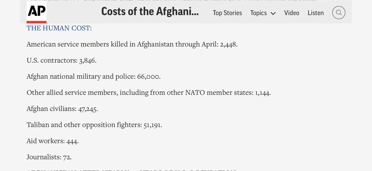 2) Даже если забыть о жертвах среди западных союзников и 200 тысячах убитых афганцев, американские потери занижены почти вдвое, по состоянию на 2018ый год в Афгане погибло больше 4000 американцев.