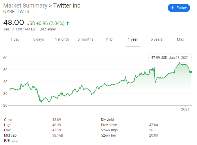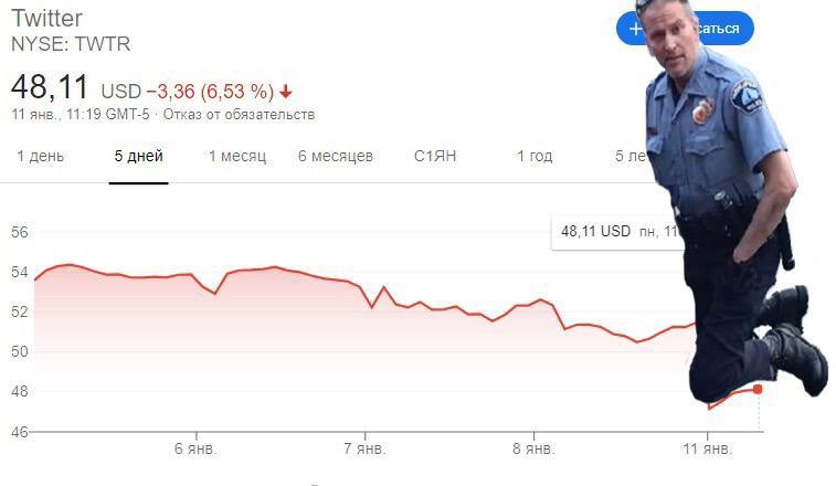 После вечной блокировки аккаунта Трампа и многих его сторонников акции Твиттера рухнули на 12,3%. Аналитики это падение оценивают в 39 миллиардов капитализации. Интересно, что на это скажут акционеры?