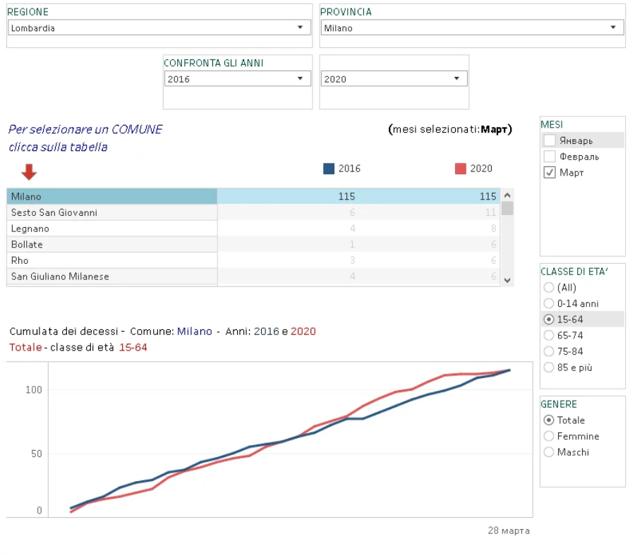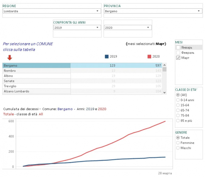 В апреле Национальный институт статистики Италии (ISTAT) опубликовал цифры по стране – общую смертность в Италии за январь, февраль и март 2020. Отчет опубликован здесь.
