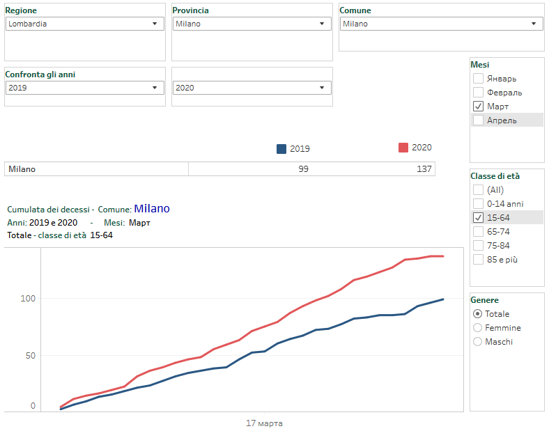 За март 2020 прирост числа смертей составил те же ~450, как и в случае с Миланом. Хотя Бергамо гораздо меньше, пугаться сразу не стоит. Снова проведем возрастное сравнение. Кликаю точку 15-64, перебираю другие года и вижу: