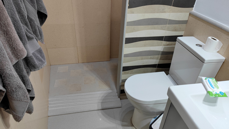 В тот же вечер выяснилось, что у местного полуоткрытого душа - совершенно гениальная конструкция. Обычно в таких случаях делают бортик, который останавливает воду. А здесь вместо бортика наоборот - сделали слив. И пол в душе - абсолютно ровный. И у вас нет шансов не залить водой всю ванную комнату, принимая душ. Потрясающее решение!