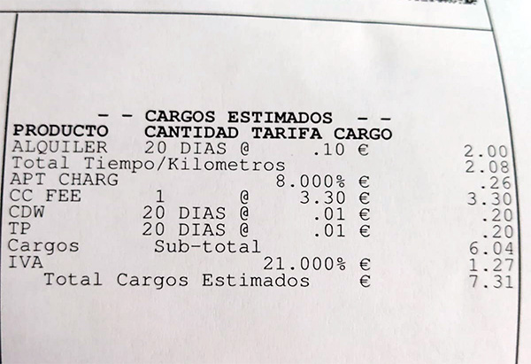 Друзья с эстонским видом на жительство сейчас живут на юге Испании. Понадобилась им там машина в аренду. Арендовали в Firefly (это lowcost-подразделение Hertz). Прислали счет на аренду полюбоваться. Я аж прям прифигел. Seat Leon, почти новый - 20 тысяч пробега. Смотрите на цену. €7,31 на 20 дней. Коммунизм какой-то...